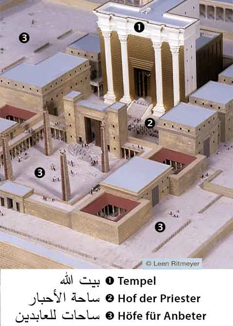 Der Tempel wurde vom Prophet König Salomo von 966 bis 959 v. Chr. erbaut. Die Gläubigen überall in der Welt wandten sich beim Beten dem Tempel Gottes zu. Niemand durfte in den Tempel, außer die diensthabenden Priester, die ihn betraten, um Weihrauch zu Ehren Gottes zu verbrennen, Öl in die Lampen zu füllen oder Brot auf den Opfertisch zu legen. Der Tempel Gottes war von einem ummauerten Innenhof umgeben, in dem die Priester auf einem großen Altar Opfer darbrachten. Zur Zeit unseres Herrn Jesus, dem Messias, war dieser Hof von drei weiteren Höfen umgeben, in denen sich die Menschen versammelten, um zu Gott zu beten und Lehrern zuzuhören. Für weitere Informationen siehe Tempelkomplex und Innere des Tempels.