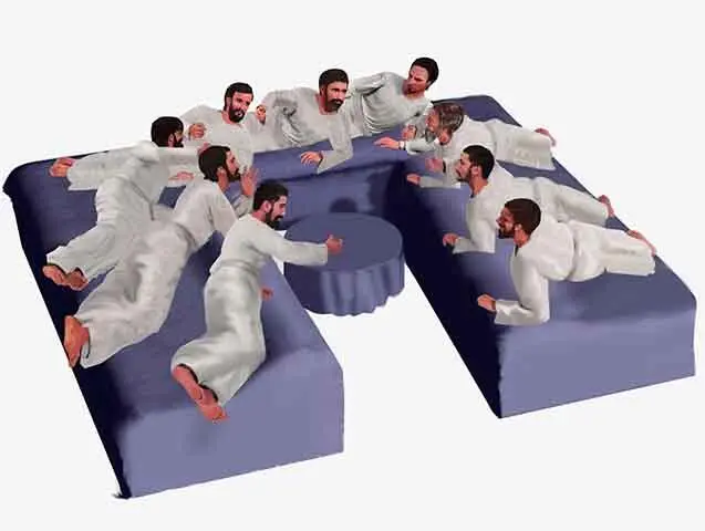 ein niedriger Tisch, auf den das Essen gestellt wurde. Wenn ein Gastgeber zu jener Zeit Gäste zu einem feierlichen Abendessen einlud, lehnten er und die Gäste sich Seite an Seite auf Liegen, die kreisförmig um einen niedrigen Tisch lagen. Sie lehnten sich auf ihren linken Ellbogen und nahmen das Essen mit der rechten Hand ein. Ihre Füße streckten sie weg vom Essen über das Seitenende der Liege. Bestenfalls gab es drei Liegen und ein bis drei kleine Tische. Die Liegen waren manchmal aus Backstein oder Stein mit einem Kissen darauf. Bei Festessen in wohlhabenden Häusern durften Zuschauer manchmal das Haus betreten und entlang der Wände stehen, das Essen beobachten und dem Gespräch zuhören.