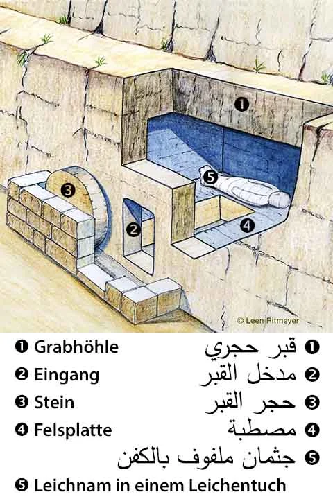 Zur Zeit des Messias waren die meisten Gräber Höhlen, die die Menschen in den Fels eines Hügels gegraben hatten. Jedes Grab hatte einen Eingang, der mit einem großen Rollstein, der wie ein Rad geformt war, geöffnet oder geschlossen wurde. Die meisten dieser Gräber konnten mehrere Leichname aufnehmen, die zu verschiedenen Zeiten dort abgelegt wurden, jeder an seinem eigenen Platz. Etwa ein Jahr später entfernten die Verwandten die Gebeine und legten sie in einen kleinen Behälter.