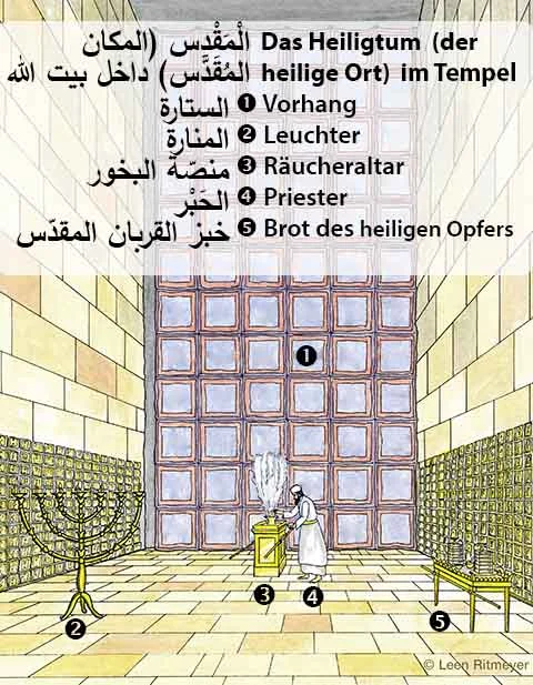 In einigen Übersetzungen wird er der heilige Ort oder das Allerheiligste genannt. Es wurde von einem Leuchter, der sieben Lampen hatte, erleuchtet, und es hatte einen Tisch, auf den Brot gelegt wurde, um Gott für seine Versorgung zu danken. (Siehe Tora, 3. Mose 24,1-9). Das Hauptmerkmal war der Räucheraltar. Während sich die Menschen in den Tempelhöfen zum Gebet versammelten, nahm ein Priester Kohlen vom Brandopferaltar, brachte sie in den Tempel und legte sie auf den Räucheraltar. Er verbrannte dann Weihrauch auf diesen Kohlen, um die vielen Gebete zu symbolisieren, die zu Gott aufstiegen.